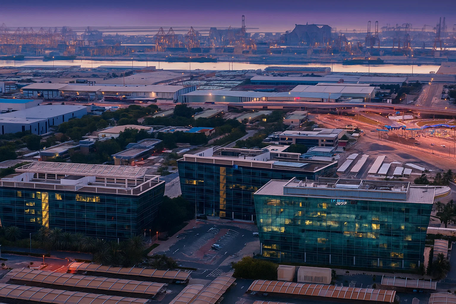 بوابة دبي للتصنيع واللوجستيات؛ بجوار ميناء جبل علي وبالقرب من مطار آل مكتوم — بنية تحتية للمستودعات والمكاتب، وخدمات الجمارك داخل الموقع، واتصال سريع بالأسواق الإقليمية والعالمية.